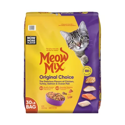 Features & Benefits: Contains one (1) 30–pound bag of Meow Mix Original Choice Dry Cat Food More of the flavor cats love One hundred percent complete and balanced nutrition for adult cats High quality protein helps support strong, healthy muscles Produced in the U.S.A. from globally sourced ingredients