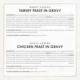 Guaranteed Analysis: Gravy Lovers Turkey Feast in Roasted Turkey Flavor Gravy: Crude Protein (Min)...9.0%, Crude Fat (Min)...2.0%, Crude Fiber (Max)...1.5%, Moisture (Max)...82.0%, Ash (Max)...3.0%, Taurine (Min)...0.05% Chicken Feast in Grilled Chicken Flavor Gravy: Crude Protein (Min)...9.0%, Crude Fat (Min)...2.0%, Crude Fiber (Max)...1.5%, Moisture (Max)...82.0%, Ash (Max)...3.0%, Taurine (Min)...0.05% Beef Feast in Roasted Beef Flavor Gravy: Crude Protein (Min)...9.0%, Crude Fat (Min)...2.0%, Crude Fiber (Max)...1.5%, Moisture (Max)...82.0%, Ash (Max)...3.0%, Taurine (Min)...0.05%